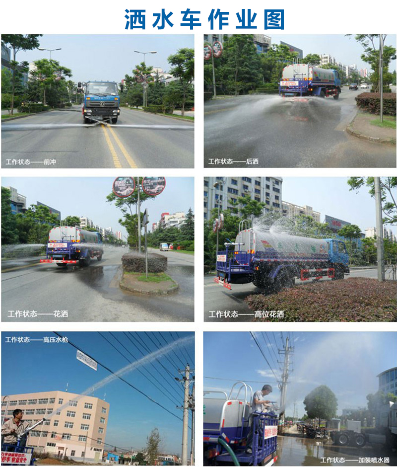 灑水車專用功能: 垂直吸程>6米,灑水寬度>14米,射程>28米。灑水車前沖(能將路面泥巴、塵土、垃圾沖干凈);后灑(能均勻地將水灑在路 面,一次灑水寬度>14米)、前側噴(花灑)(能均勻地將路旁綠化帶澆灌)、帶后工作平臺,平臺上安裝綠化灑水高炮(炮有大雨、中雨、毛毛雨、霧狀 可調節)。配備全國質量領先的大功率專用灑水泵,引水時間 <5分鐘,流量 90立方/小時 。 帶消防接頭,帶自流閥,帶自吸功能。